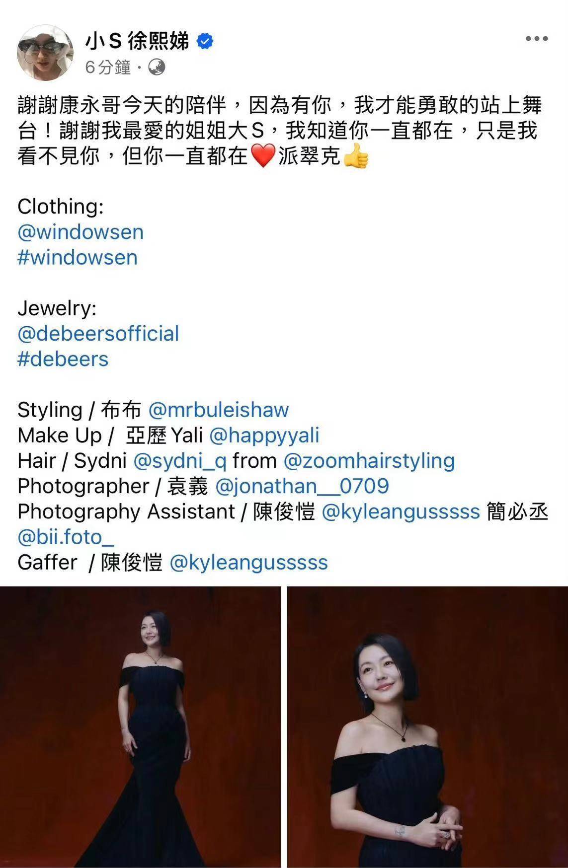 领奖后小S发文感谢蔡康永,感谢他的陪伴,因为有他,才能勇敢的站上舞台,还感谢她姐姐大S,也感谢搭档派翠克。